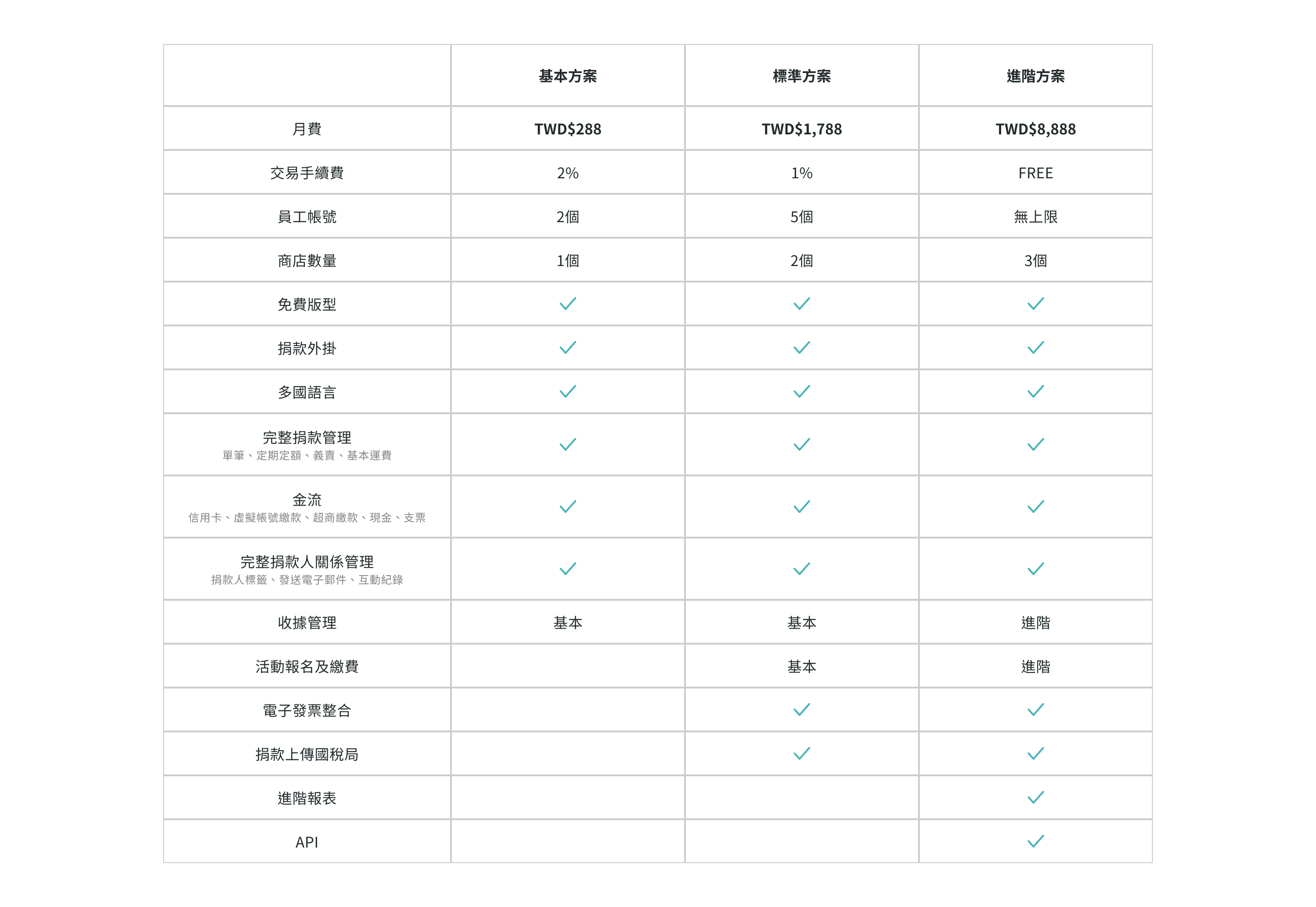樂意捐提供多種方案,依據您的需求採用不同的方案,基本的將會有月費以及手續費。